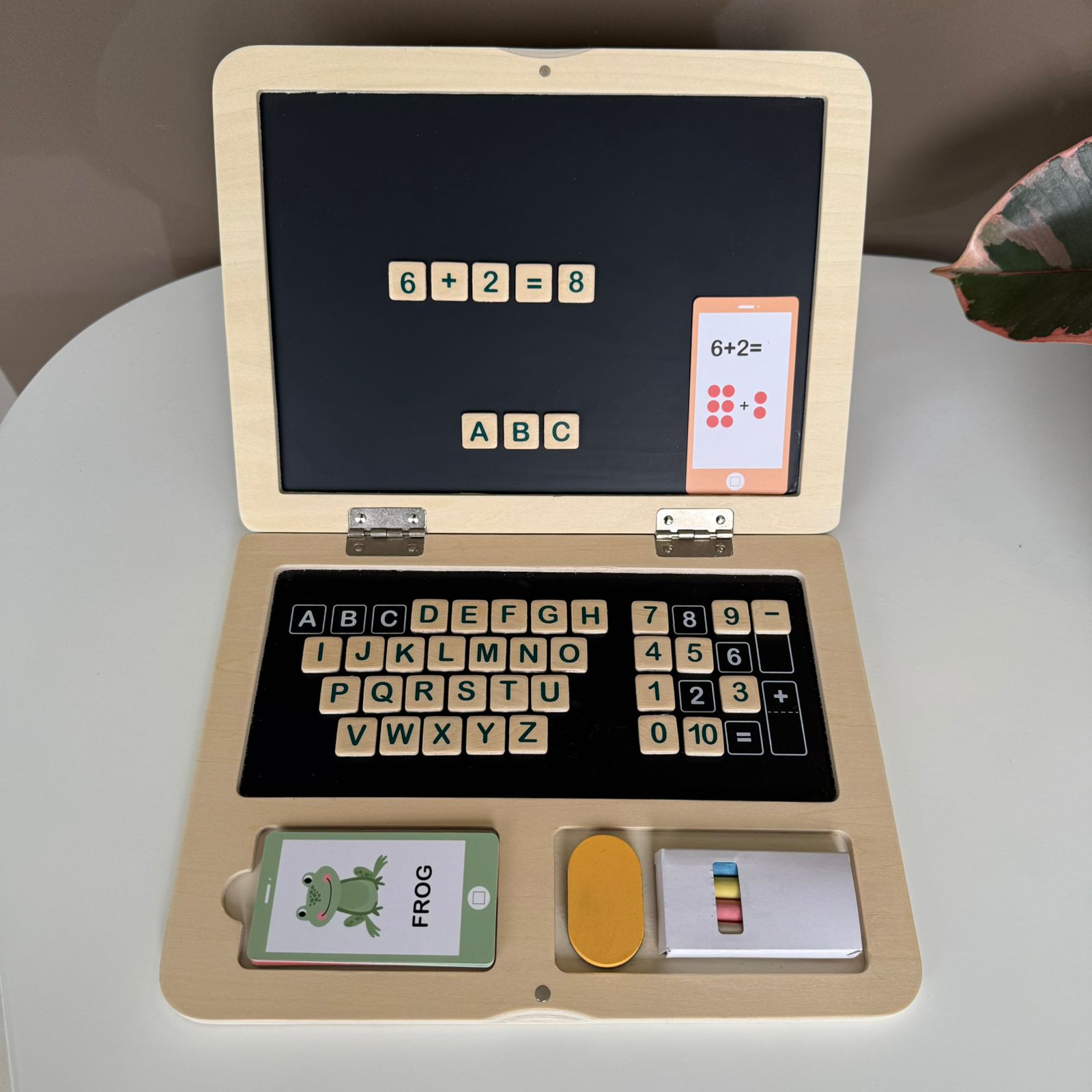 O Notebook de Madeira Educativo é o companheiro ideal para as primeiras descobertas das crianças! Inspirado em um notebook de verdade, ele abre possibilidades infinitas de aprendizado com seu design inteligente: uma lousa para giz onde os pequenos podem desenhar, escrever e soltar a criatividade e ao mesmo tempo possui base magnética para brincar com alfabeto e números; Perfeito para formar palavras, treinar letras, fazer contas e brincar com várias possibilidades.