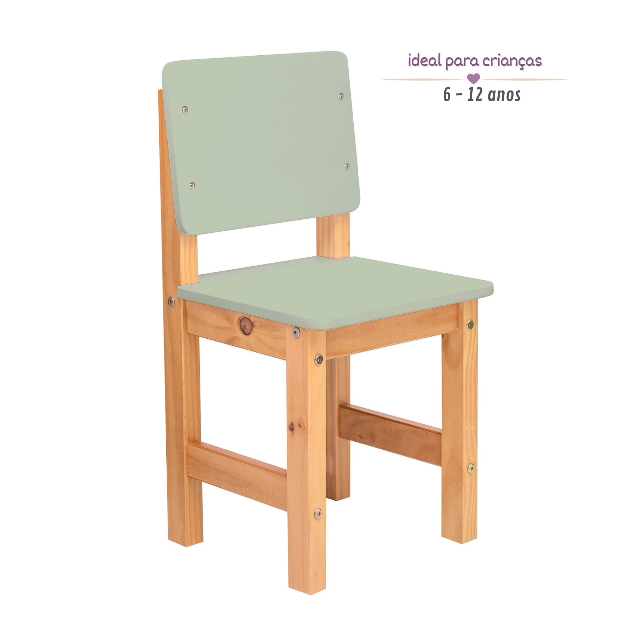 Nossa Cadeira Juvenil é fabricada em madeira maciça pinus, com acabamento em verniz amendoado, que realça o charme natural da madeira. As partes coloridas são produzidas em MDF com pintura em laca fosca, resistente a riscos, garantindo durabilidade e estilo.
