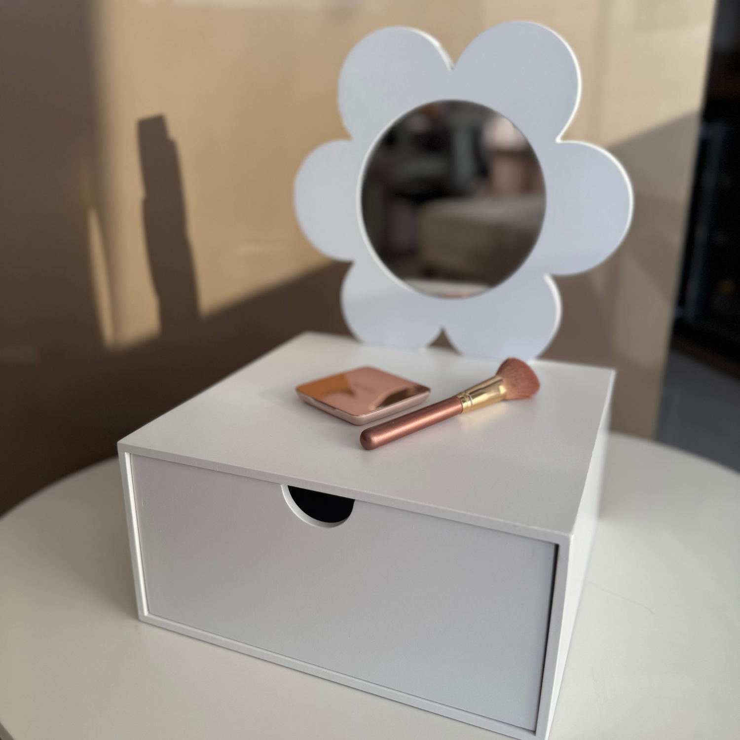 Transforme qualquer cantinho em um espaço mágico! Nossa penteadeira infantil compacta foi criada para encantar as crianças e trazer praticidade para o dia a dia. Com um delicado formato de flor e um charmoso espelho redondo, ela estimula a imaginação e o cuidado pessoal de forma divertida.